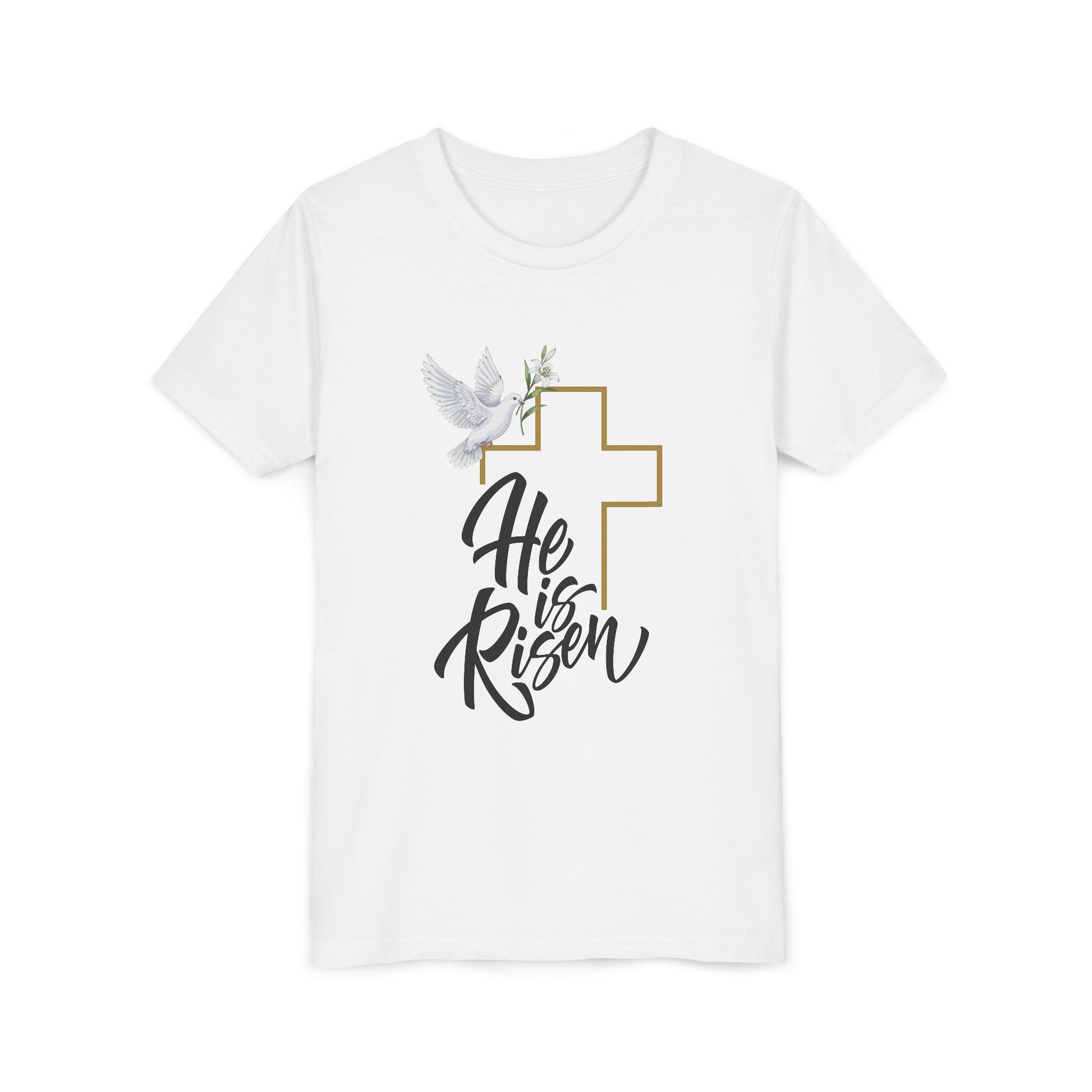 He Is Risen Youth Tee — Easter Cross & Dove Christian Kids Shirt