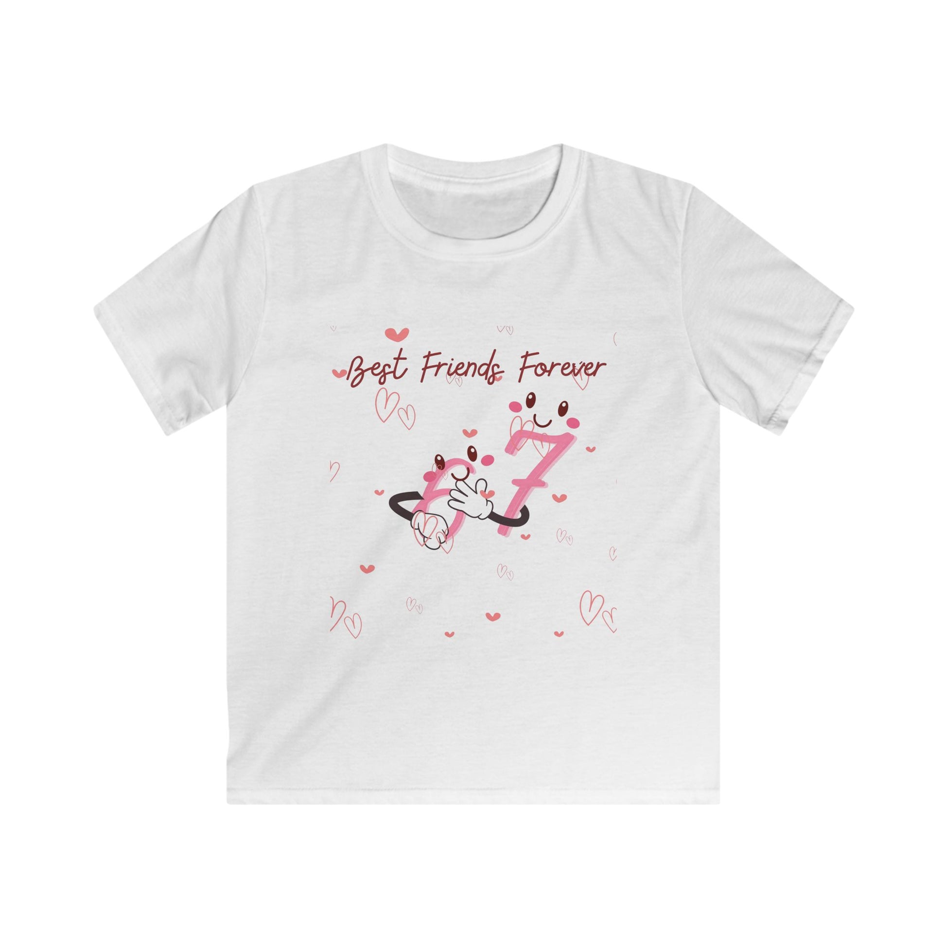 This lightweight kids tee brings Valentine’s joy to little ones who love playful pals and sweet messages. The front shows two adorable characters hugging a cheerful number 7 beneath the handwritten phrase “Best Friends Forever,” while the back features a flowing “Happy Valentine’s Day” script with scattered hearts. Soft, smooth fabric and a classic fit let children move freely during playdates, school parties, or cozy family moments. The tear-away label and gentle knit feel keep sensitive skin happy, and the subtle pink accents make it feel handmade and heartfelt — like a tiny wearable valentine.