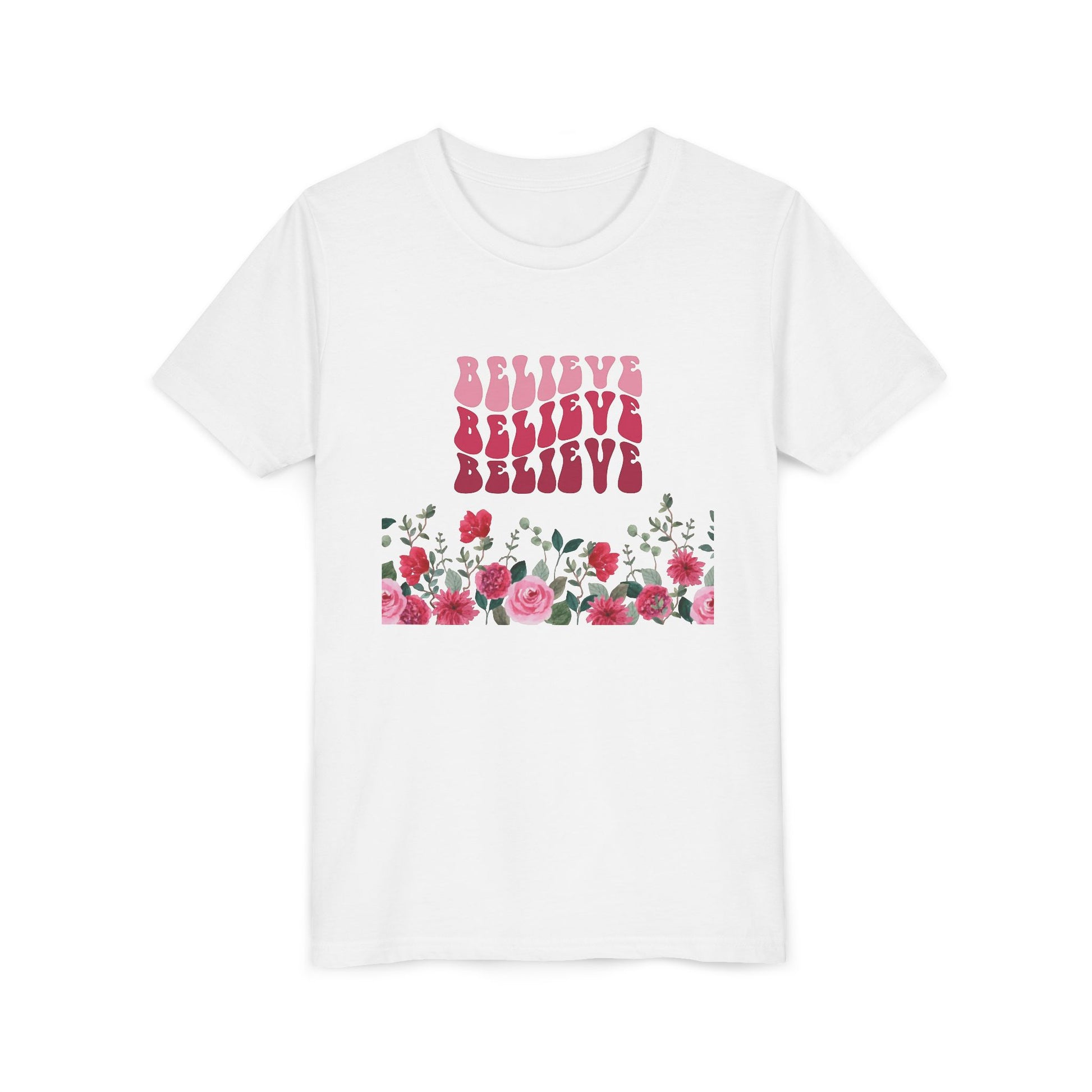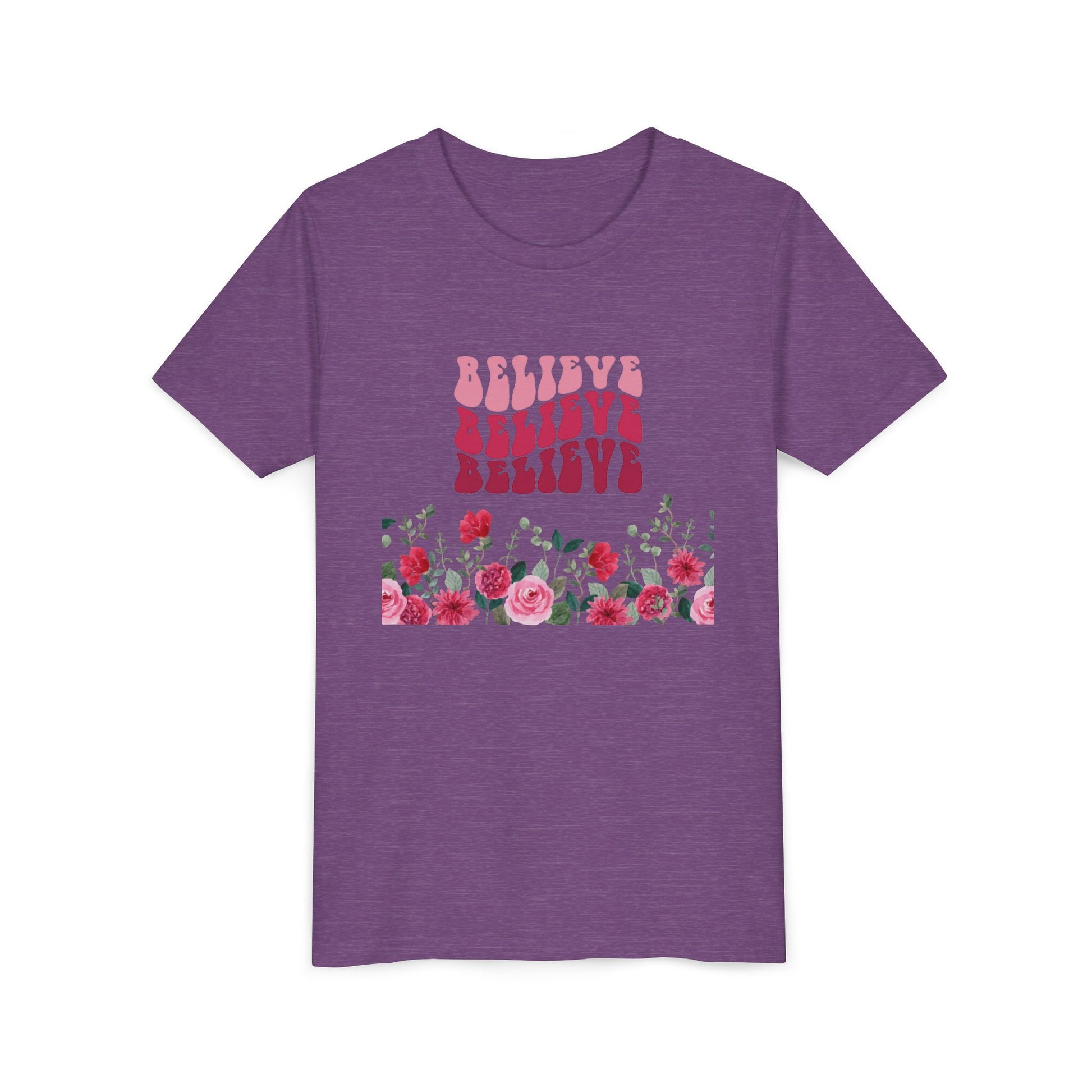 Youth Tee-- "Believe" Floral Graphic Christian Worship Shirt